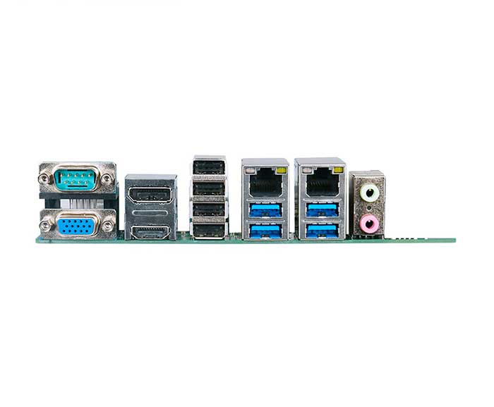 DB9 COM1 (RS232, 5V/12V output selected by jumping cap), VGA, HDMI, DP